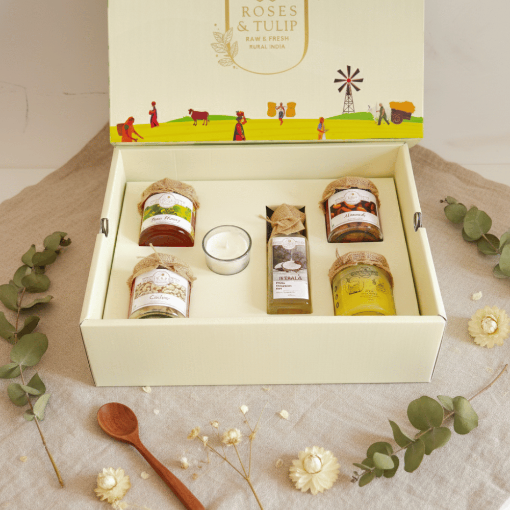 Experience the essence of nature's bounty with the Roses and Tulip Natural Harvest hamper. This thoughtfully curated gift box is a celebration of pure, wholesome goodness, perfect for anyone who appreciates a touch of natural luxury.